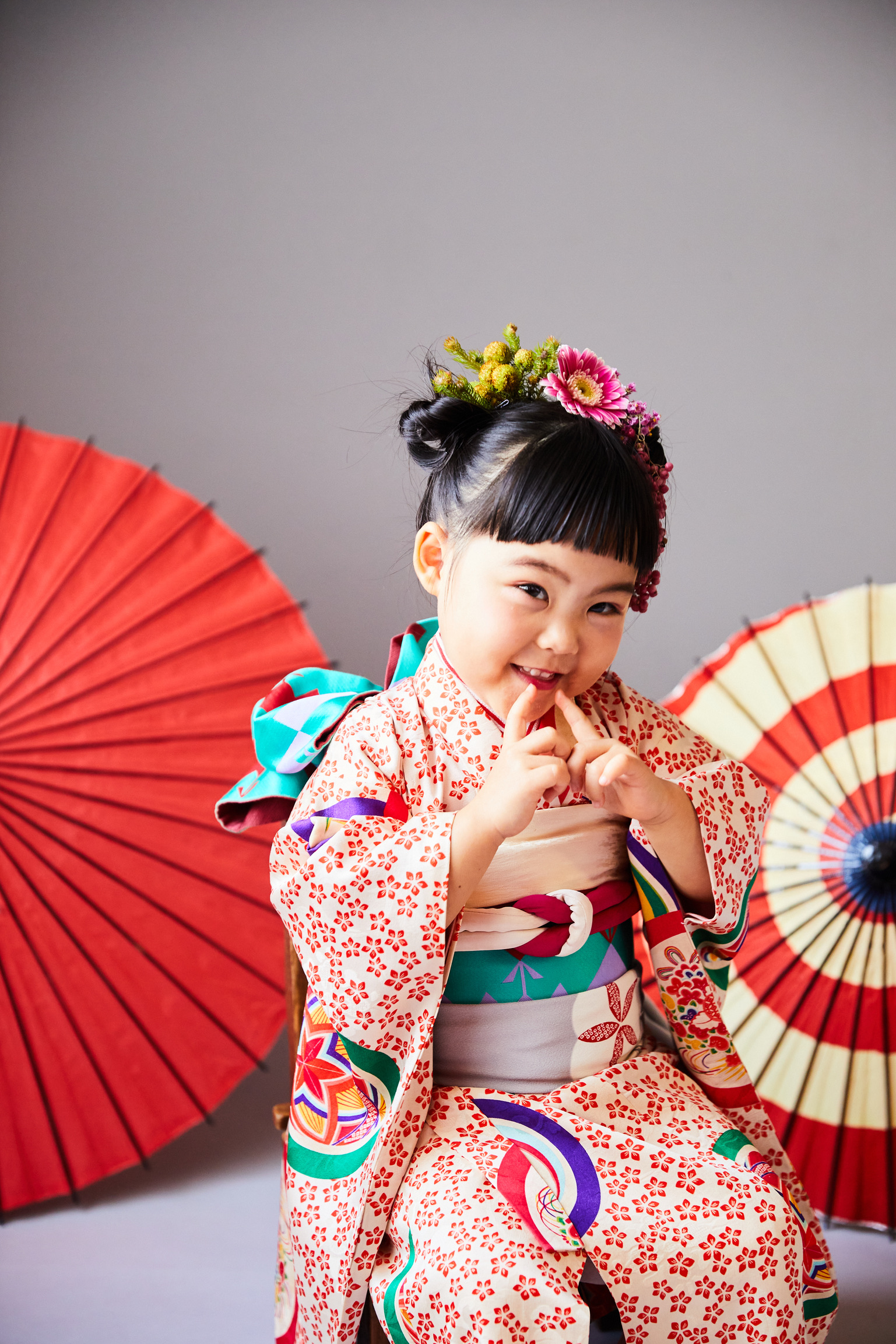 3歳の七五三では帯を結ばずに着物の上に被布を羽織る3歳独自のスタイルと、大人のように帯を結ぶスタイルがございます。