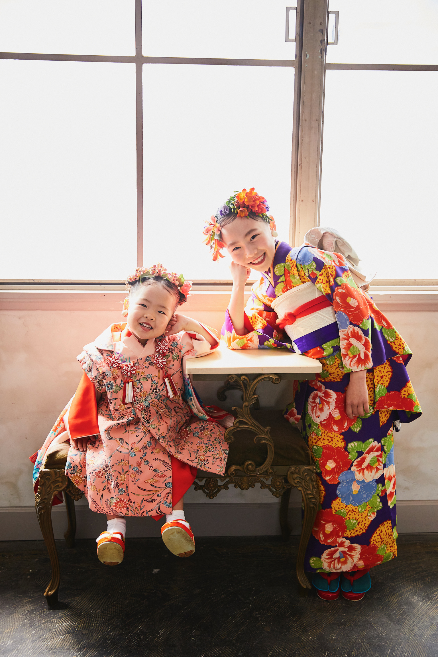 3歳の七五三では帯を結ばずに着物の上に被布を羽織る3歳独自のスタイルと、大人のように帯を結ぶスタイルがございます。