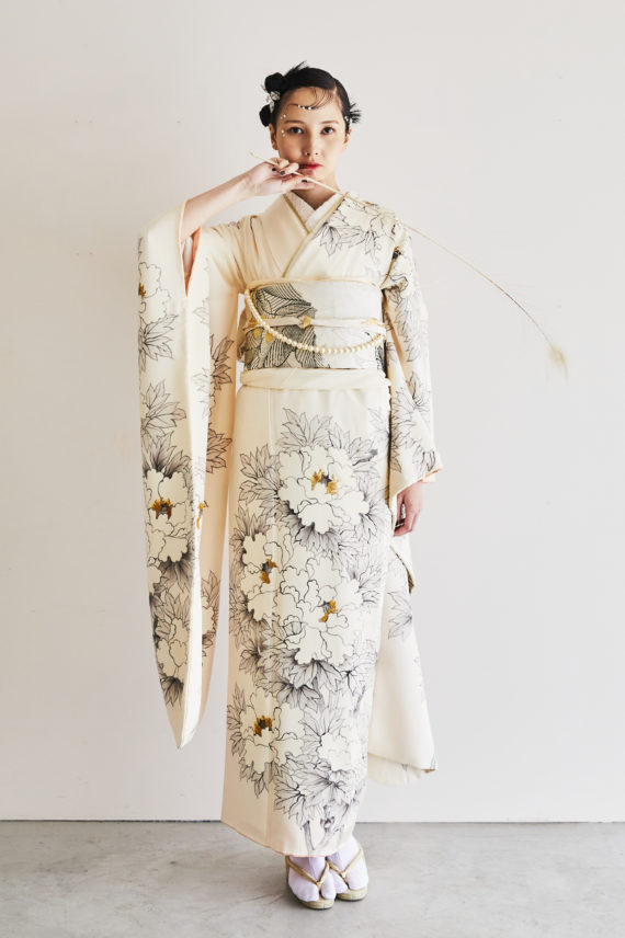 白地に手描きの牡丹をあしらった上品な振袖238,000円