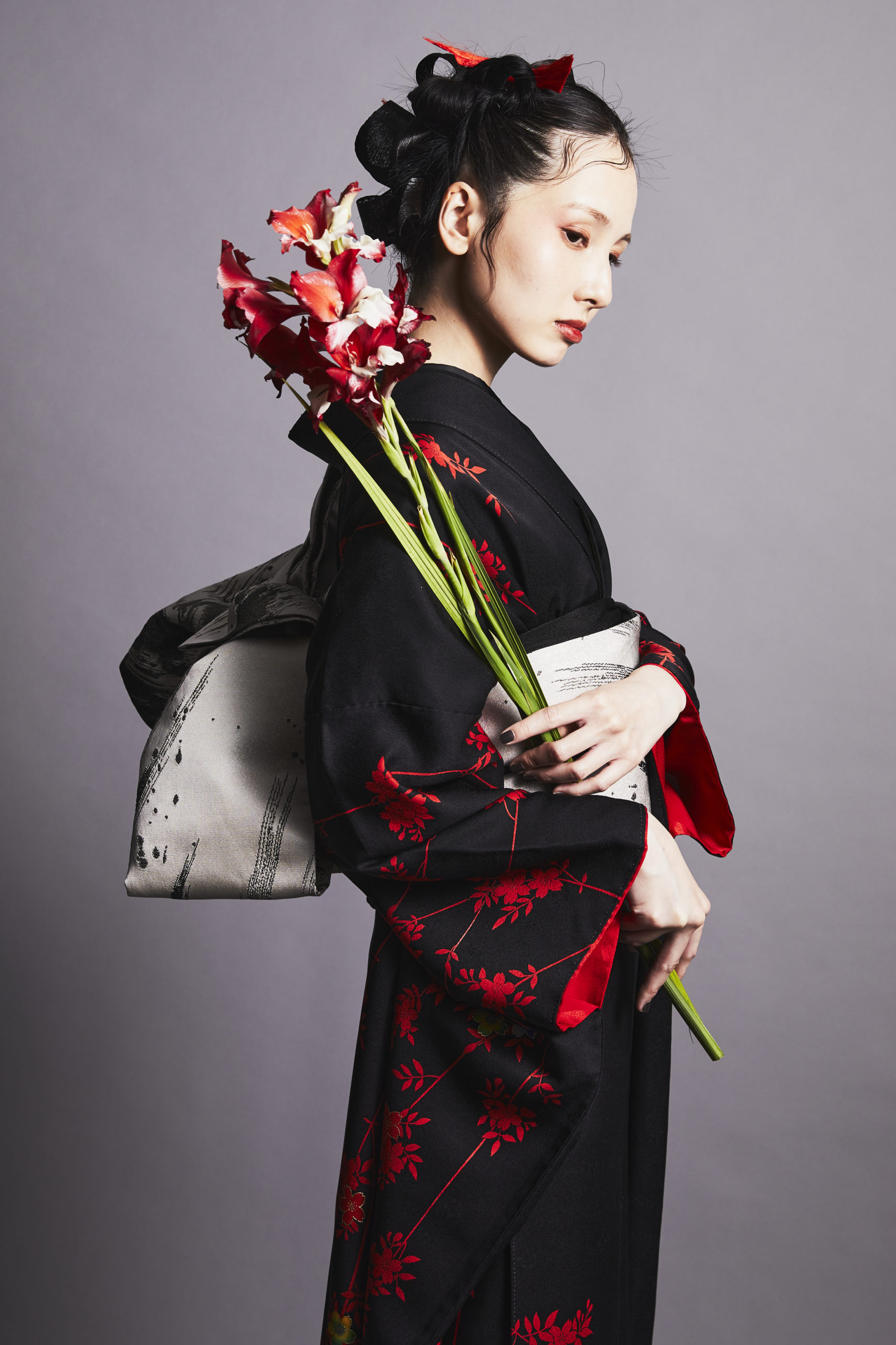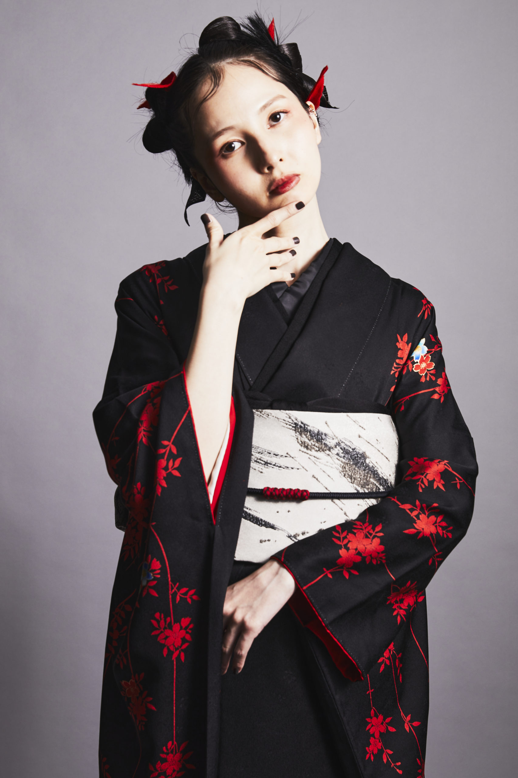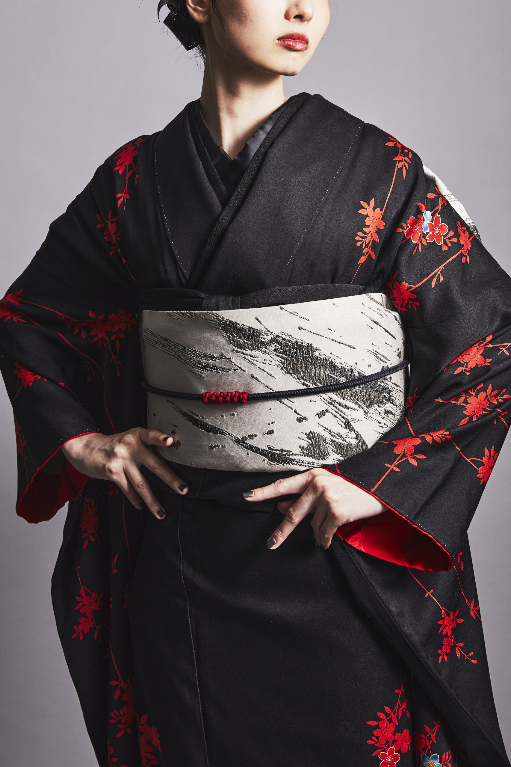 黒地に赤い枝垂桜の紋様がクールでモダンな印象です。小物も黒で統一し
