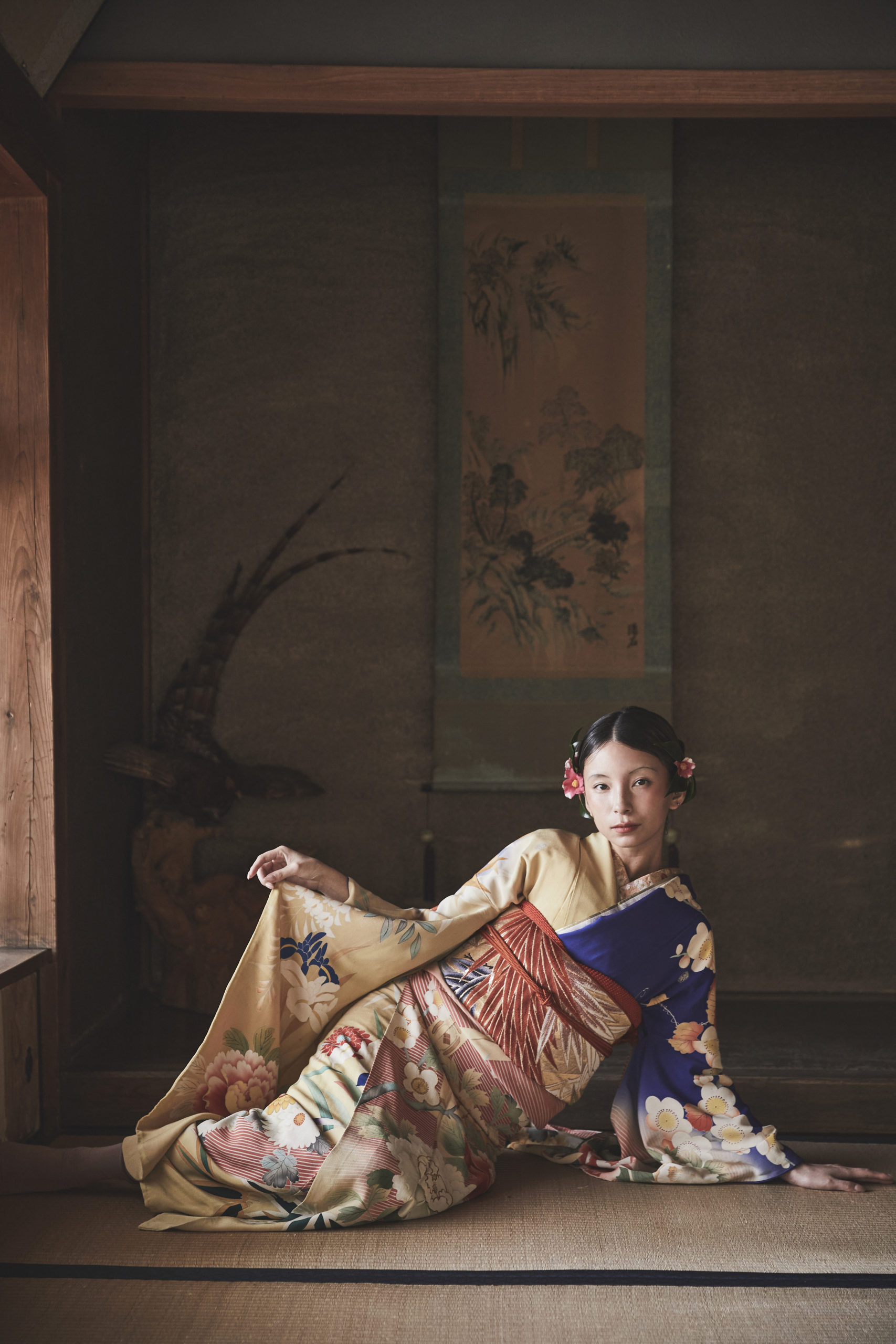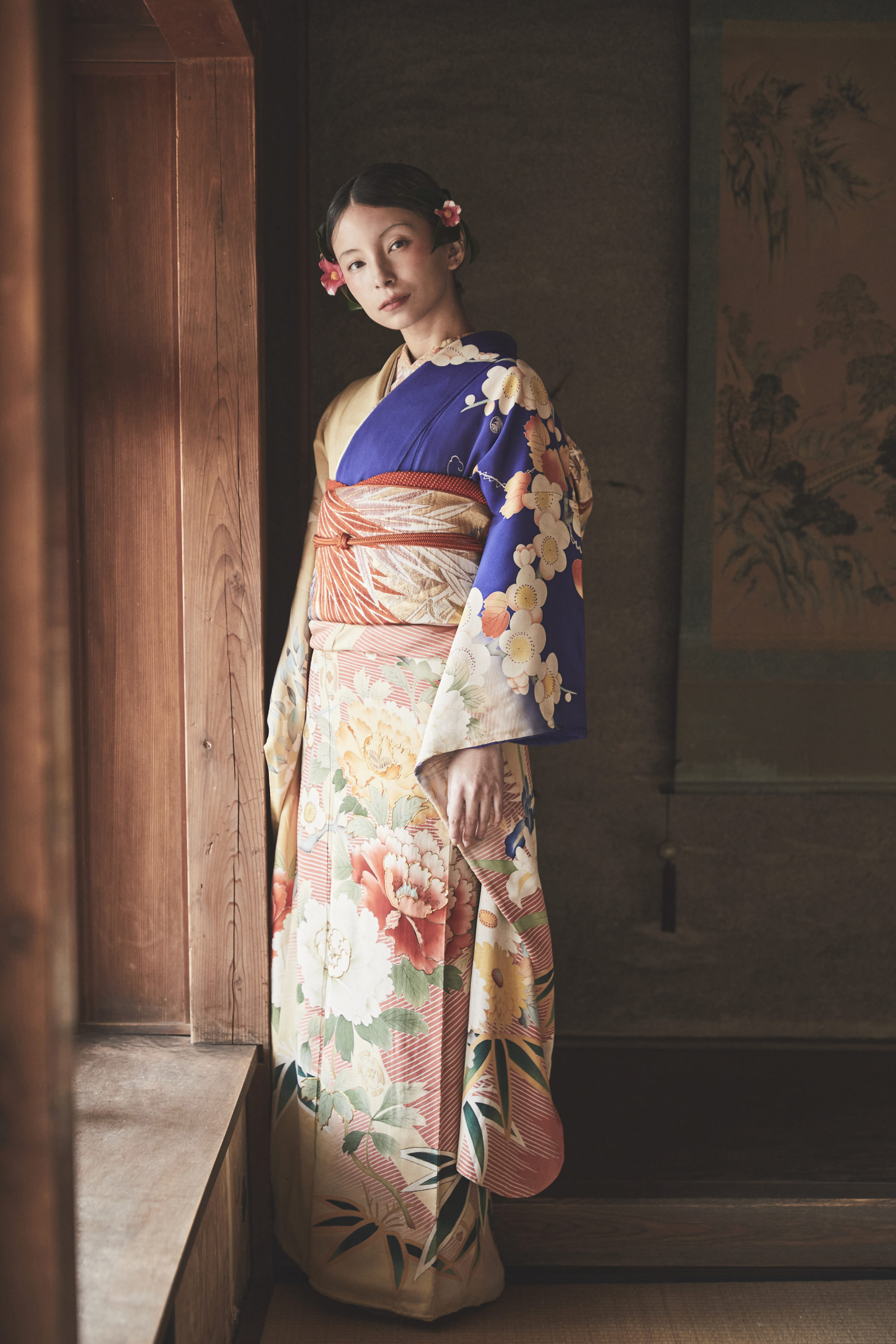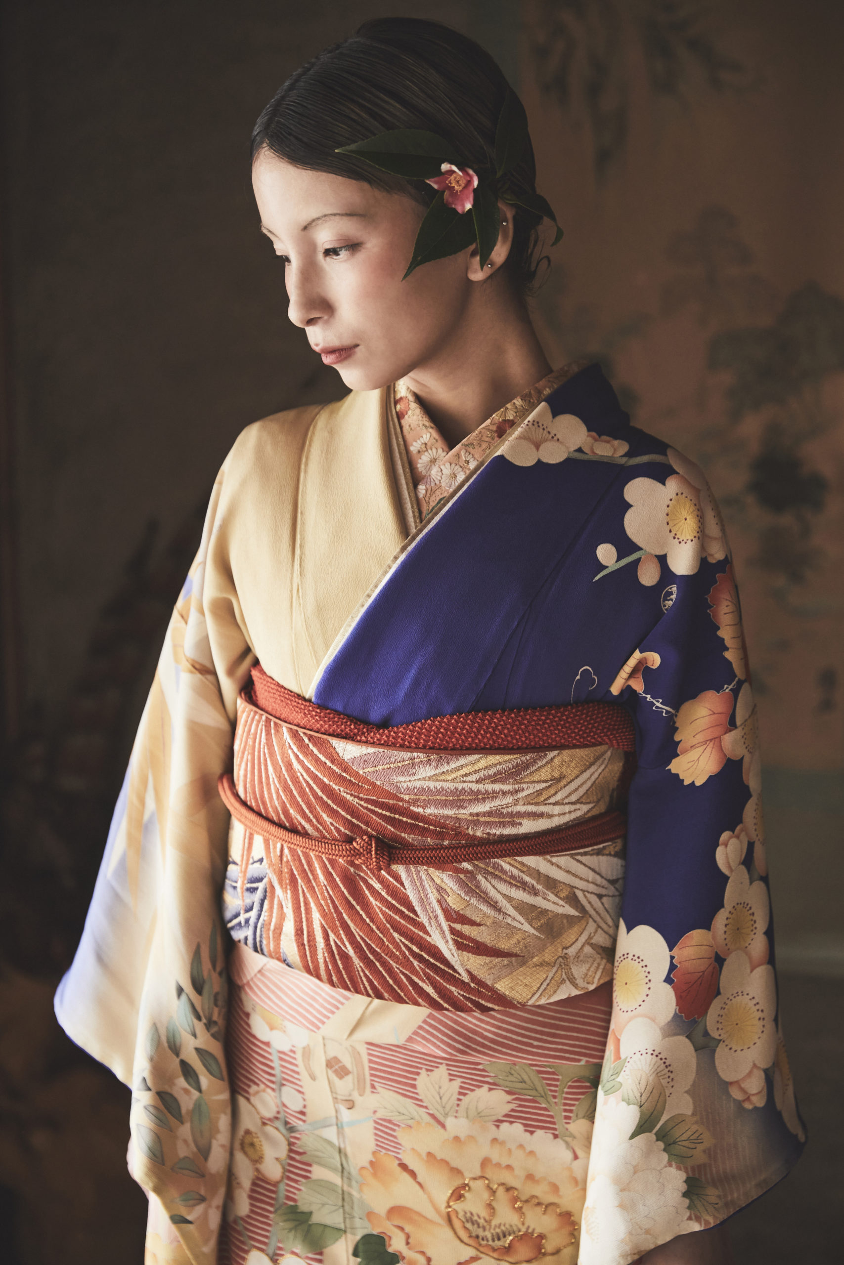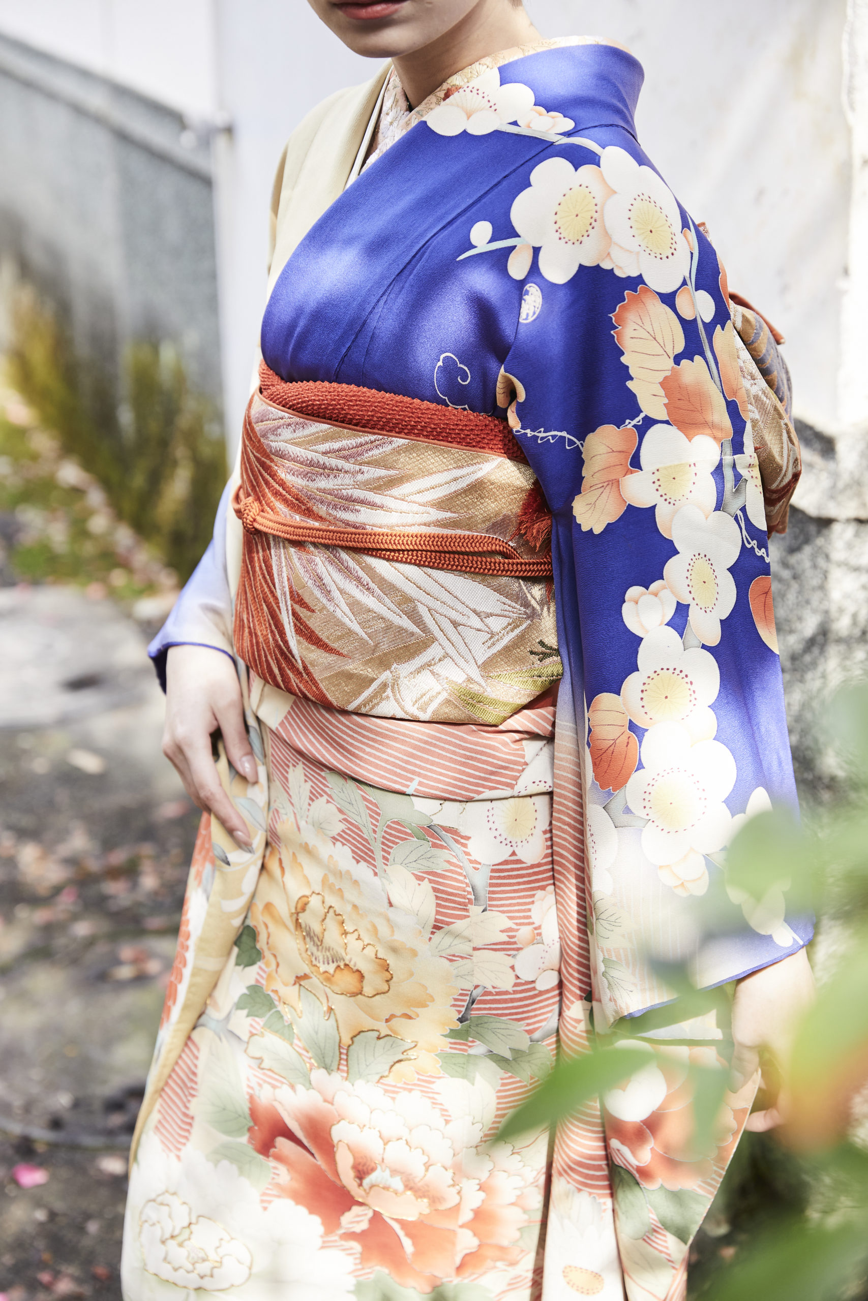 左右で表情の異なる配色や、裾へ向かって流れるような構図が、着る人の立ち姿をより美しく引き立てます。
