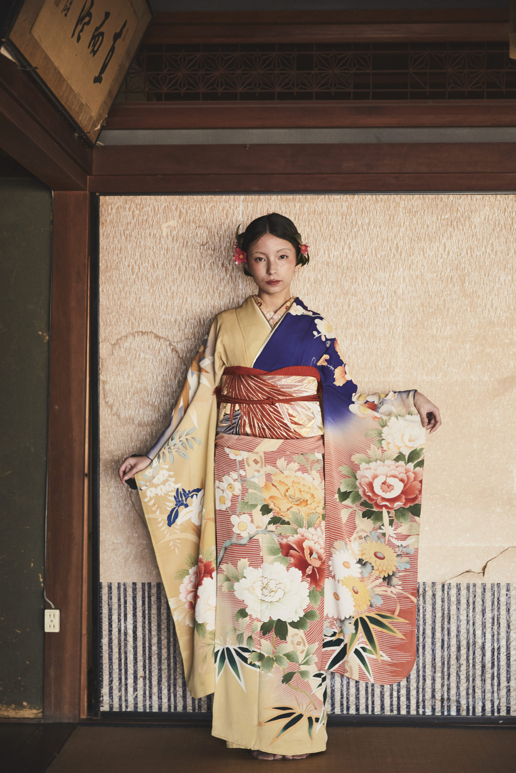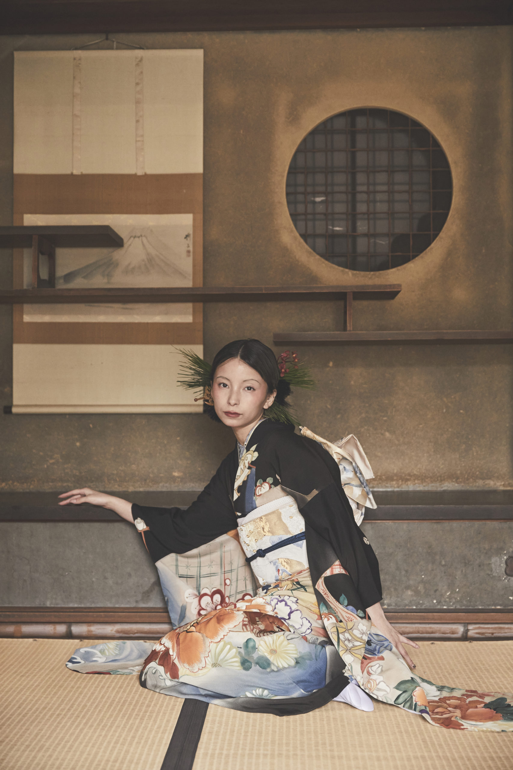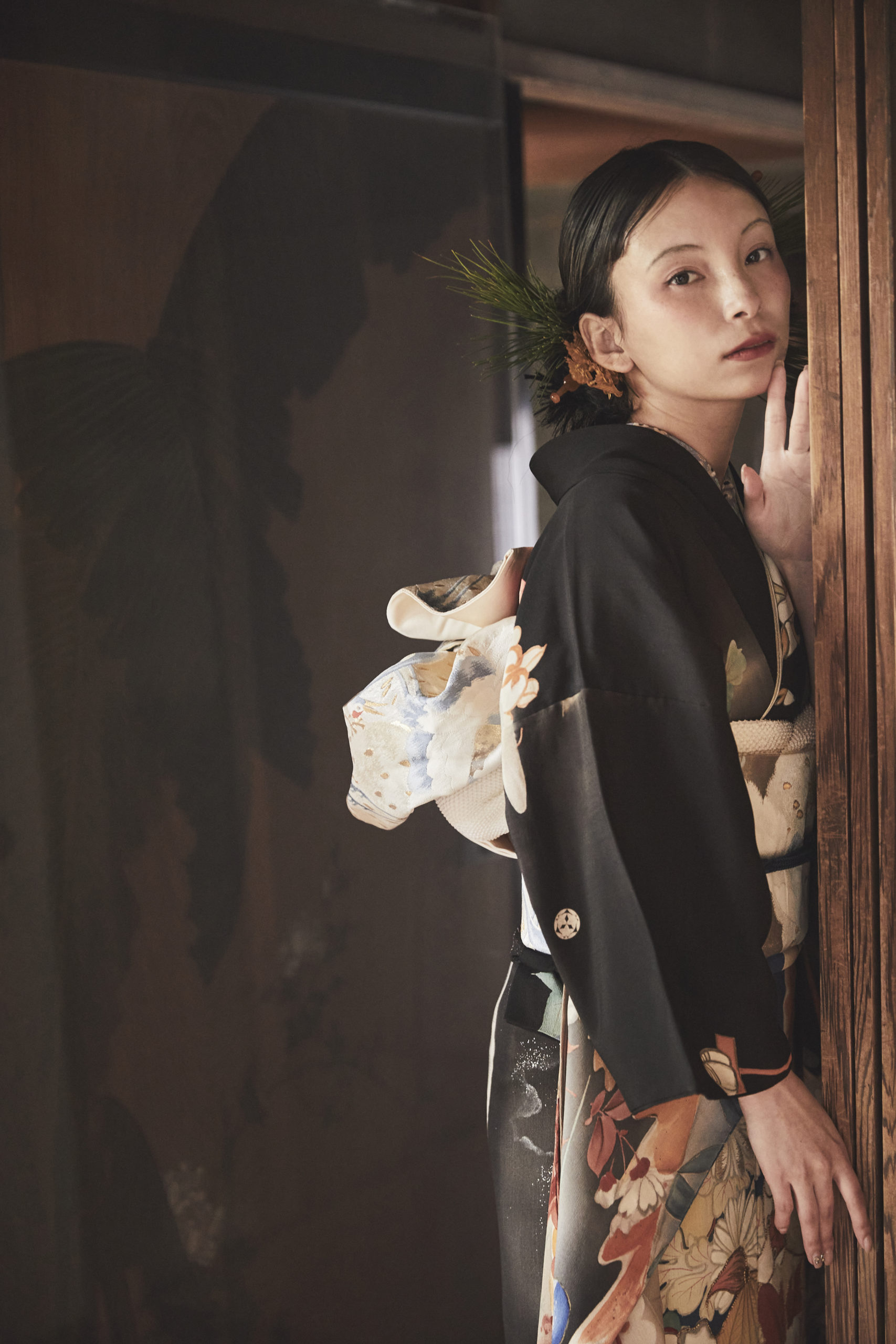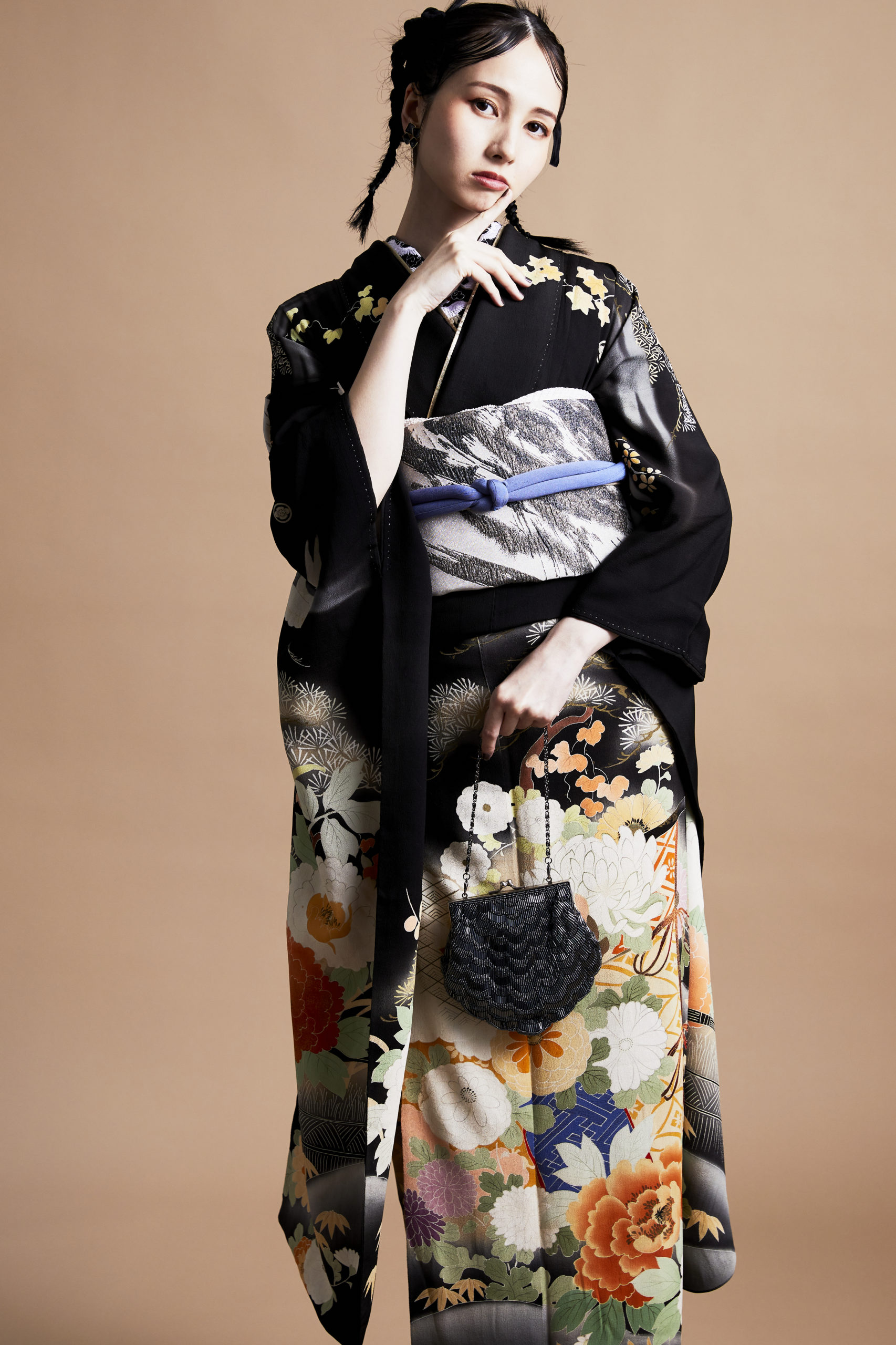 黒地の振袖は、大人への境界線に立つ象徴的な色。そこに込められた吉祥文様の願いが、静かな覚悟とともに未来へとつながります。